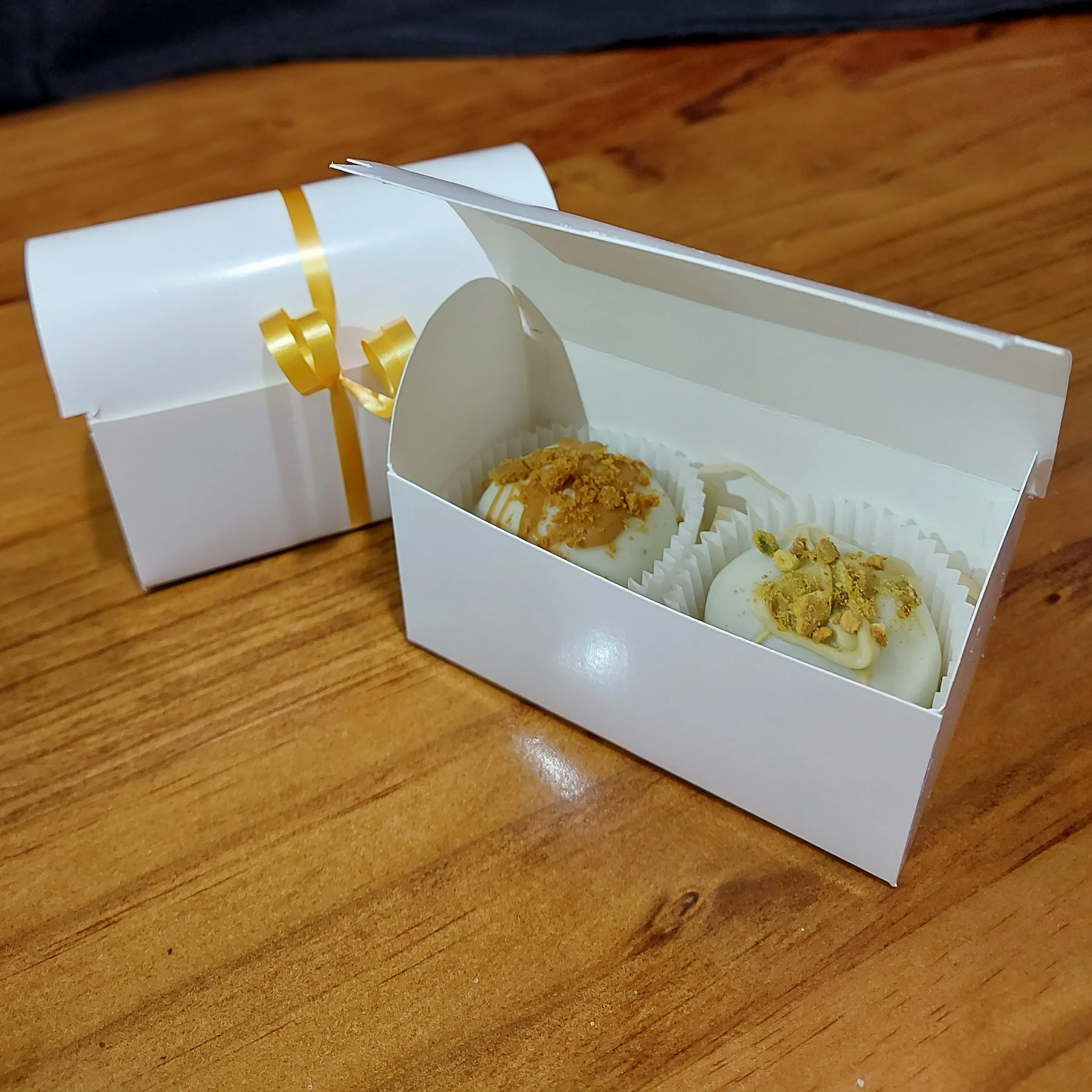 Our range of indulgent truffles have all been developed in house with rich flavours perfect for your special occasion. We offer the option of two or three truffles beautfully presented in the boxes pictured below, tied with a gold ribbon and with the option of a personalised thankyou card.